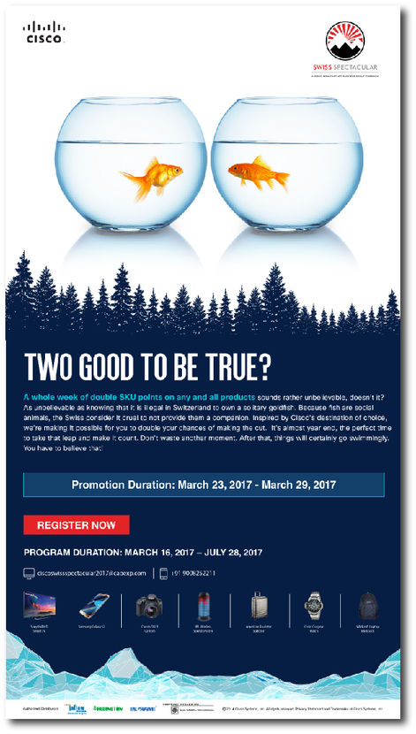 CISCO's exclusive in-house program aimed at motivating employees to achieve specific targets and earn points for a chance to win a trip to Switzerland. Created a visually compelling design language that encompassed logo creation, mailers, website design, teasers, backdrops and standees.